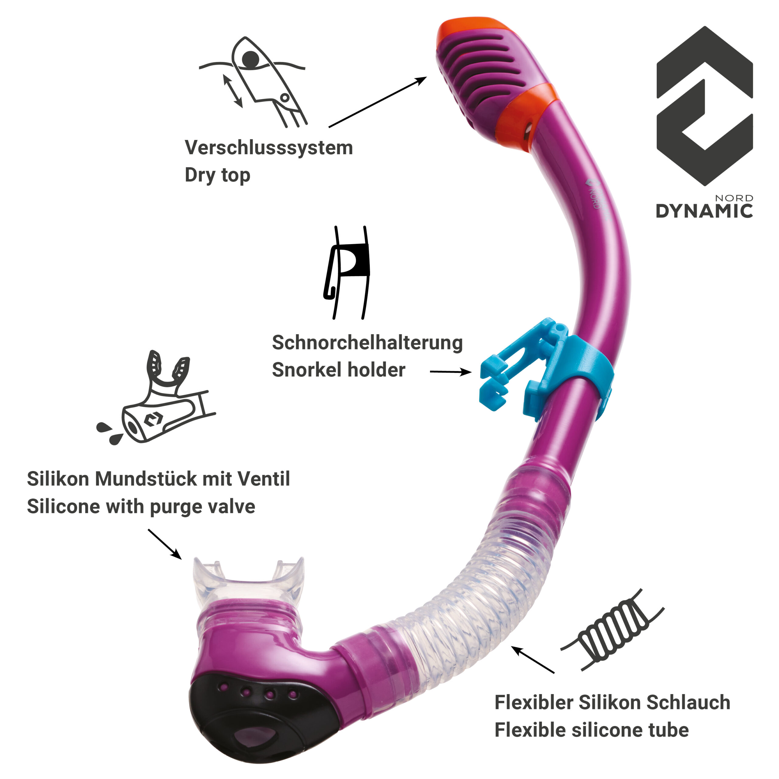 Anatomical valve snorkel with silicone comfort mouthpiece & easily adjustable clip snorkel holder which that can be easily opened to attach the snorkel to the mask strap Anatomical snorkel tube with signal Splash Top